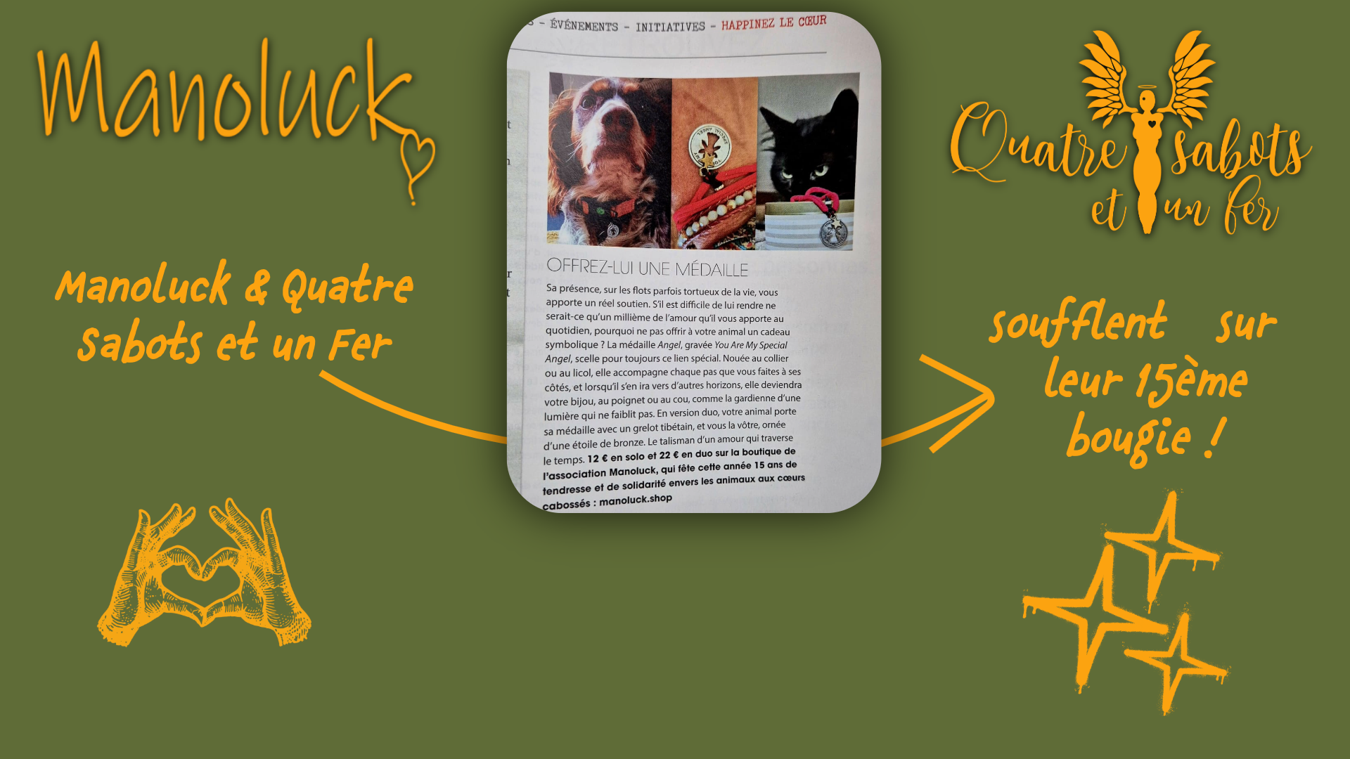 Demandez votre amulette Manoluck et participez à la campagne 10%, prenez un selfie avec votre 4🐾Love et l'amulette, choisissez l'asso de votre choix qui rend beau le monde ici et ailleurs, Manoluck se chargera de reverser 10% de la vente de cette amulette et vous informera step by step.Une campagne qui a le don de soi puisque comme vous le savez Manoluck est la marque solidaire d'amulettes bonheur au profit des animaux alors si en prime elle partage 10% de son ♡ pour une autre asso qui contribue au beau faire... Double bonheur garanti !